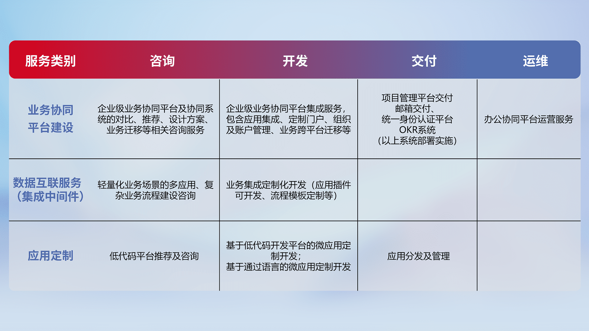 针对钉钉、、、、企微、、IDaas等平台级产品提供产品的规划、、方案、、、、交付、、定制化开发等服务,,,实现如统一协同办公、、、、智能客户服务、、、、混合会议管理、、、智能数据查询、、等业务场景,,,实现数字化转型。。。